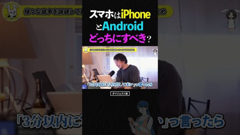 ひろゆきが「iPhoneをやめてAndroidスマホに戻りました。これで良かったのでしょうか?」という視聴者からの相談について返答する場面の切り抜きショート動画です。